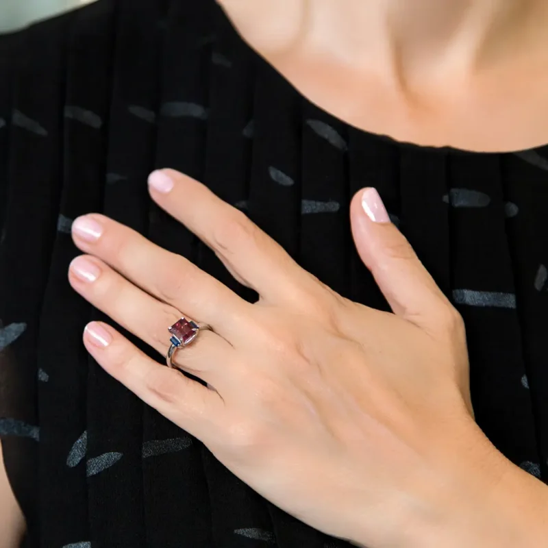 Anillo oro blanco 18k. con turmalina rosa talla esmeralda de 2,02 quilates y laterales engastados con zafiros azules talla baguette