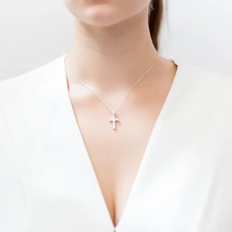 Cruz oro blanco 18k. con diamantes talla brillante con un color G-H y pureza VS con un peso total de 0,40 quilates.