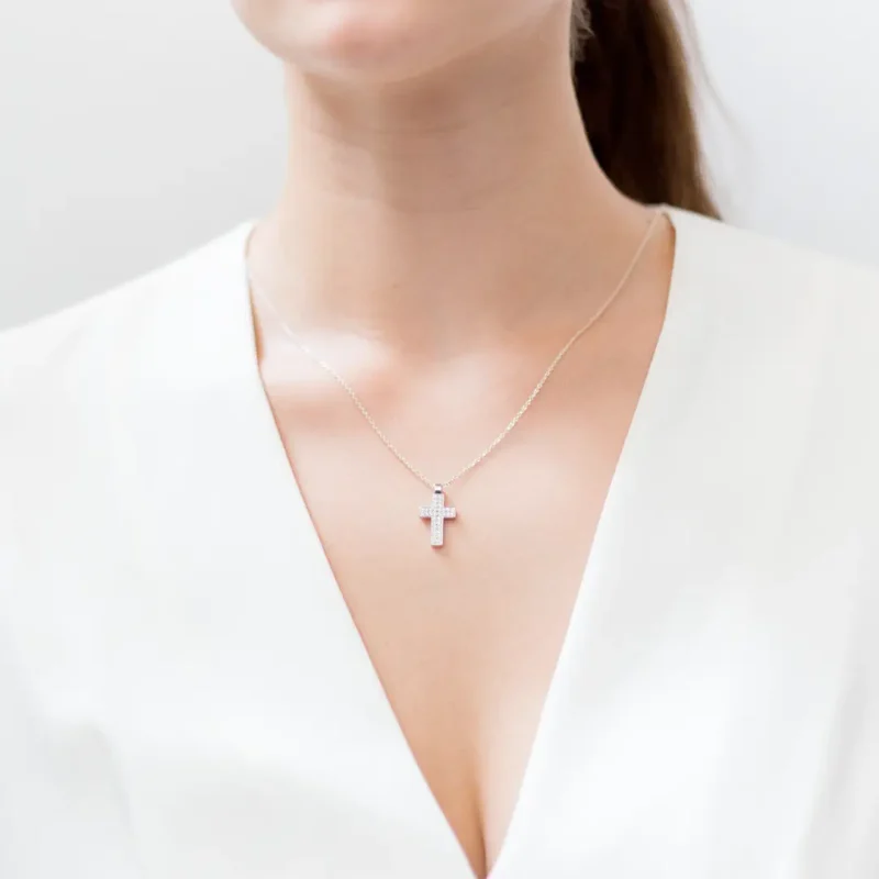 Cruz oro blanco 18k. con diamantes talla brillante con un color G-H y pureza VS con un peso total de 0,24 quilates.
